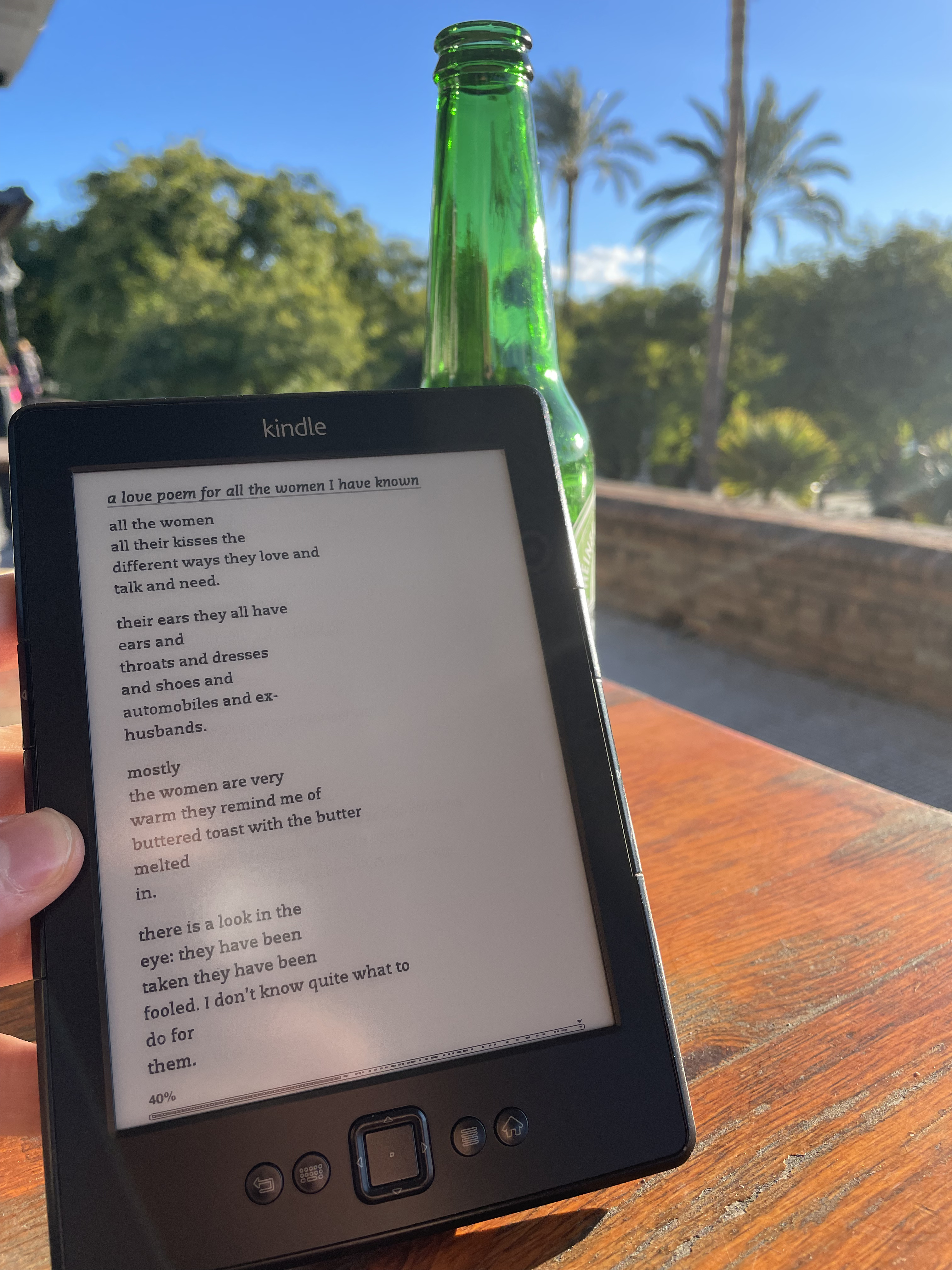 Un viernes después de todo el día trabajando en el apartamento salí a buscar un sitio tranquilo donde leer. Paseando por Paseo de Colón encontré un bar con estufas en la terraza y prácticamente vacío, así que me senté en una mesa con sillas altas un poco apartada, pedí algo de beber y saqué mi ebook. Después de un rato leyendo, el bar empezó a llenarse, hasta el punto de que todas las mesas estaban ocupadas. Como yo estaba solo en mi mesa, la camarera me preguntó si me importaría compartir mesa con un grupo de 5 chicas y 1 chico. Me parece una forma horrible de tratar a un cliente, podría haberme ido, pero lo ví como una buena oportunidad de socializar un poco y acepté. Guardé el ebook antes de que el grupo viera lo rarito que soy, se sentaron conmigo y unos minutos después estábamos brindando con unos chupitos como si nos conociéramos de toda la vida. El chico era gay –por alguna razón en Sevilla parece que una enorme parte de tíos son gays– y las chicas nada espectacular pero suficiente como para entretenerme un rato. Lo estaba pasando bien con esta gente, pero después de un rato sentí que era el momento de irme así que me despedí y me fuí a dar un paseo.